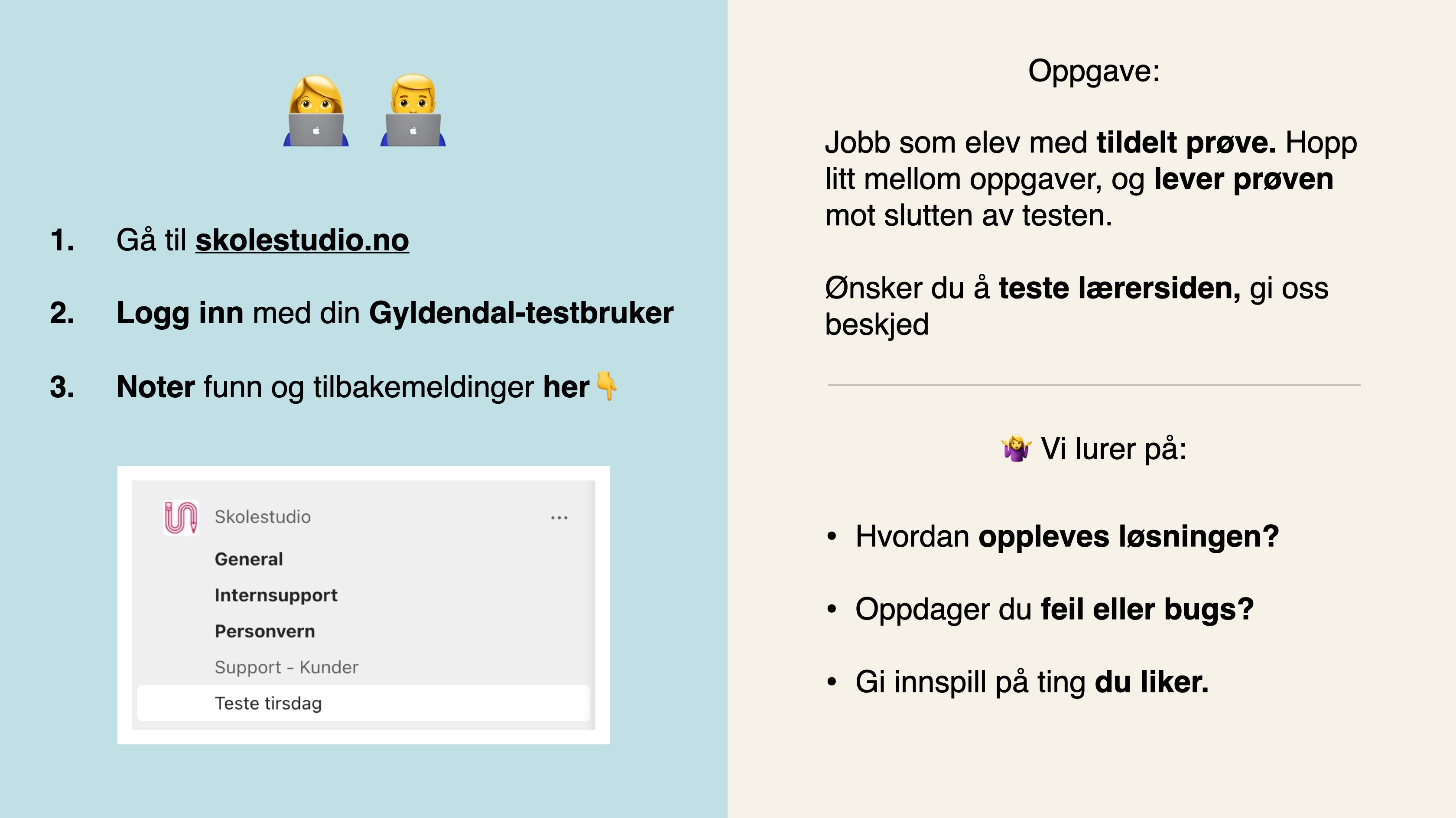 Andre ganger har vi forsøkt å reprodusere kritiske bugs brukerne våre har meldt inn. Vi har også testet innhold for feil og mangler med fasiten på papir ved siden av oss.